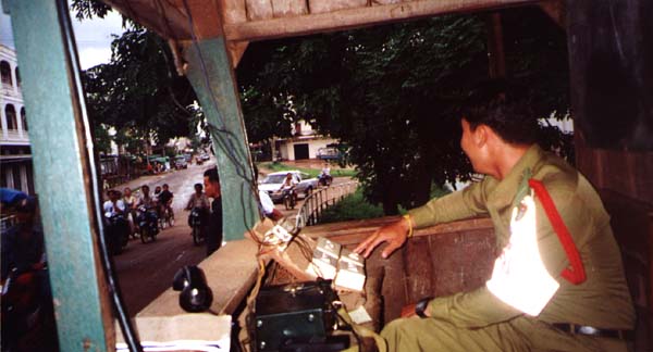 In Pakse there's a bridge that's too narrow for two lanes of traffic. So they have traffic lights at either end of the bridge to allow only one direction of traffic at a time. This guy's job is to manually operate the traffic lights. Honestly, he flips a switch to turn off the green light, switches on the orange light, waits a few seconds, and switches off the orange light and turns on the red light. All day.