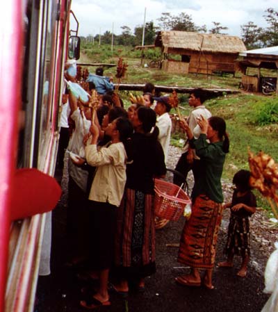 Every hour or two during southern bus travel, we'd stop in a village and all the food vendors would gather around us selling all sorts of stuff through the bus windows.