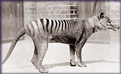 In 1936, the last known Tasmanian Tiger died at the Hobart Zoo in Hobart, Tasmania. Over the years there have been many unconfirmed sightings of Tazzie Tigers, but no solid evidence yet. There is a video clip available of that last tiger from 1936 in the zoo. Personally, I find it chilling to watch the video of this animal walking about in its cage, knowing that its extinction was the result of the deliberate, concerted, and successful efforts of humans.
